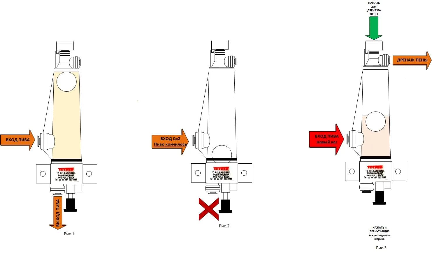 Пиво заполняет колбу Фоб-детектора из нового кега. Шарик-поплавок всплывает наверх напитка. Рычажок не забываем вновь вернуть в нижнее положение, а то в следующий раз Фоб-детектор не сработает! (Рис.3) Поскольку Фоб-детектор рекомендуется устанавливать максимально близко к кегу, то это даст возможность сократить потери пива до самых минимальных объемов.
